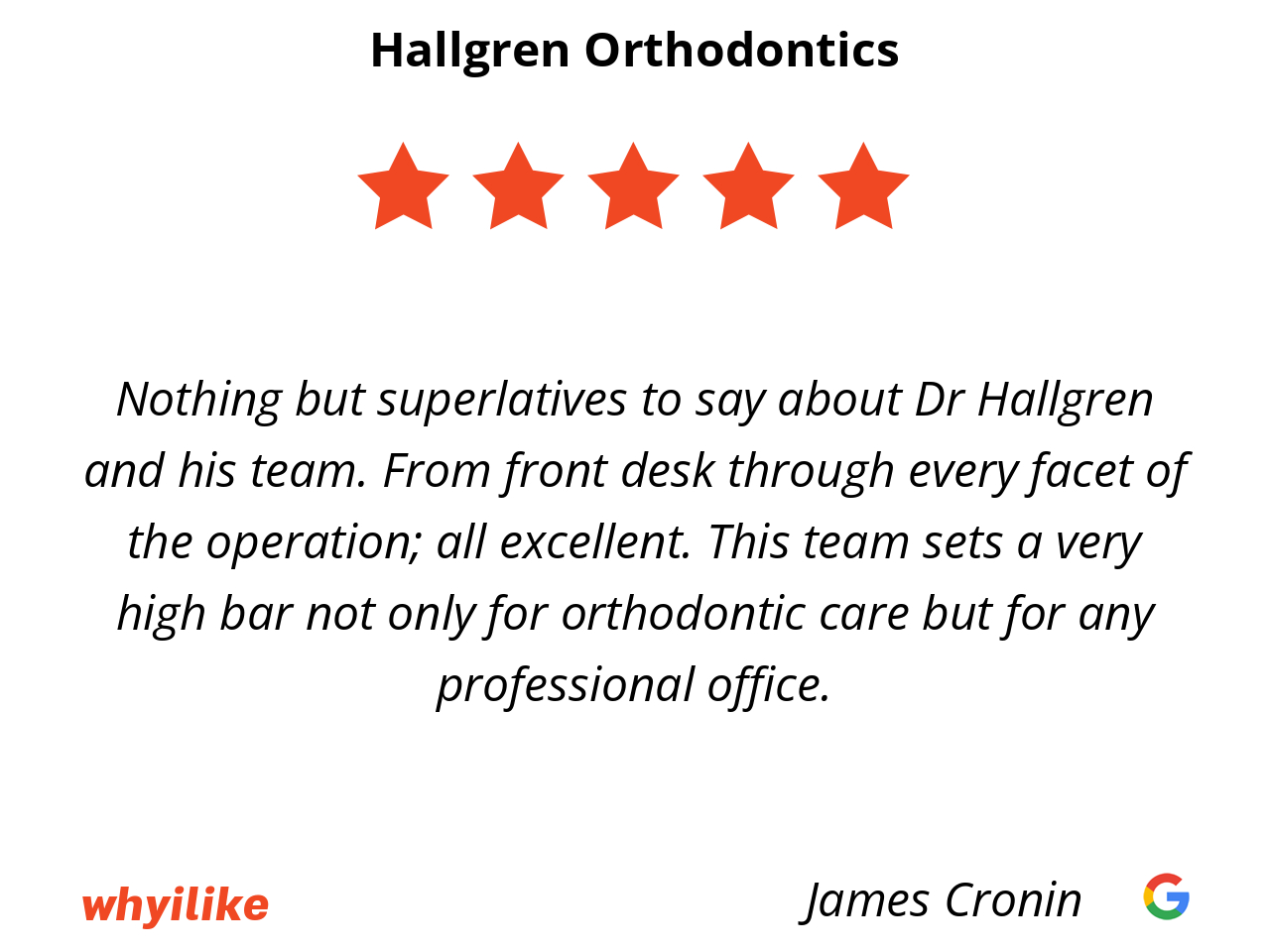 Nothing but superlatives to say about Dr Hallgren and his team. From front desk through every facet of the operation; all excellent. This team sets a very high bar not only for orthodontic care but for any professional office.