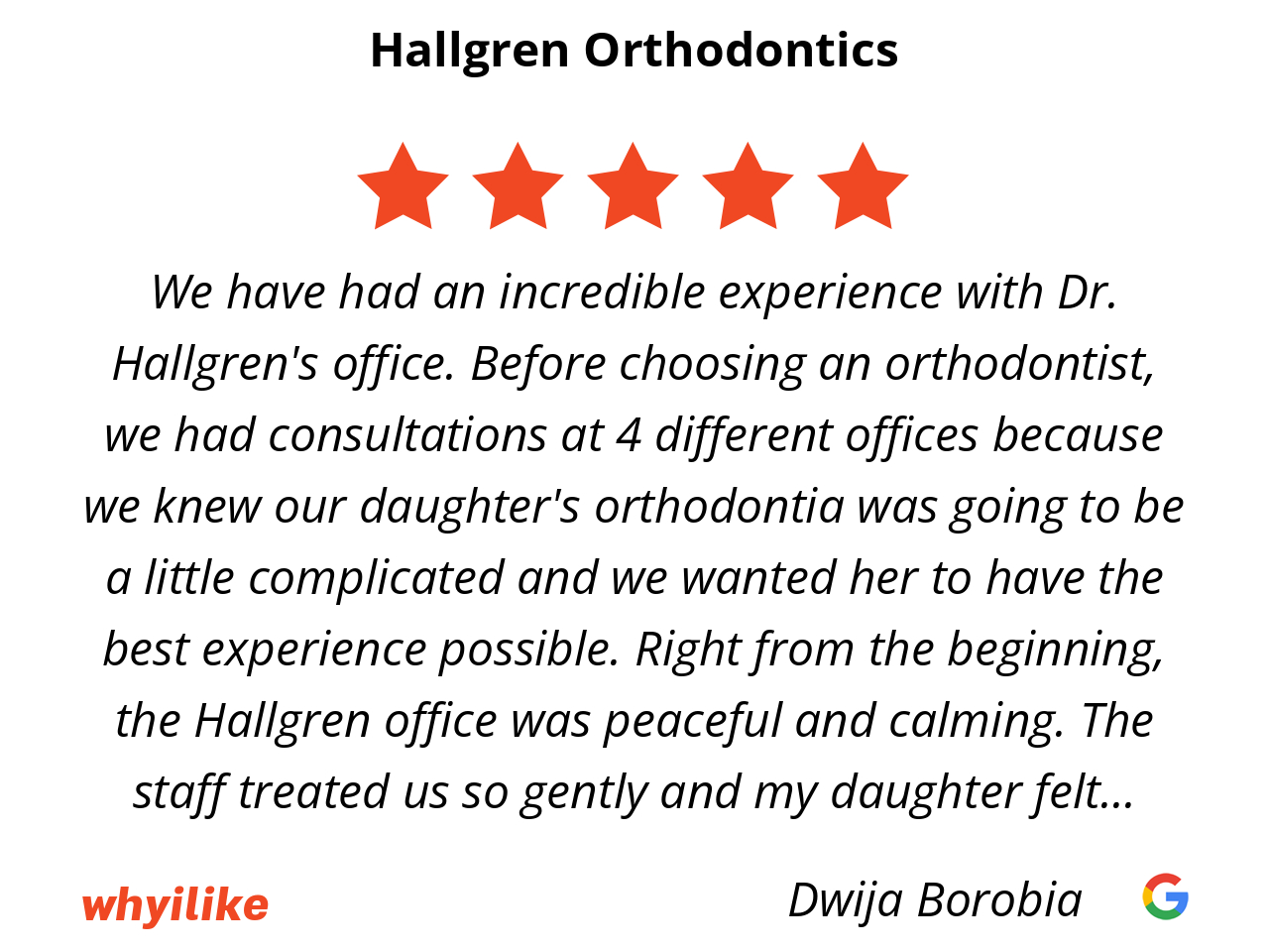 We have had an incredible experience with Dr. Hallgren's office. Before choosing an orthodontist, we had consultations at 4 different offices because we knew our daughter's orthodontia was going to be a little complicated and we wanted her to have the best experience possible. Right from the beginning, the Hallgren office was peaceful and calming. The staff treated us so gently and my daughter felt respected even though she's "just a kid." That was something she really appreciated.