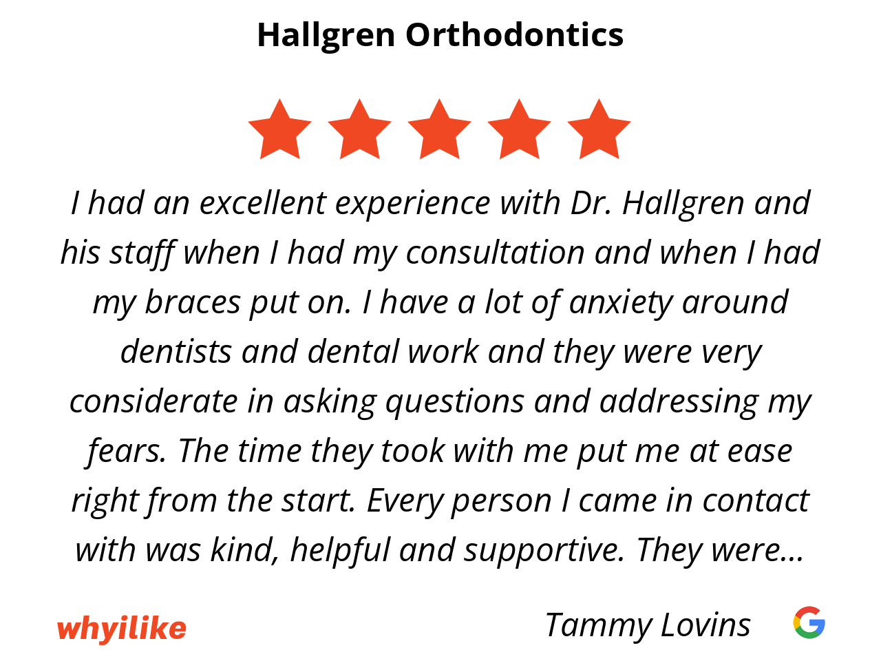 I had an excellent experience with Dr. Hallgren and his staff when I had my consultation and when I had my braces put on. I have a lot of anxiety around dentists and dental work and they were very considerate in asking questions and addressing my fears. The time they took with me put me at ease right from the start. Every person I came in contact with was kind, helpful and supportive. They were thorough in explaining everything and made sure I understood the treatment plan and felt comfortable. Having braces at 61 was never on my radar but Dr. Hallgren and his staff were amazing!!! They were so kind and reassuring and made the process go so smoothly! Everyone was wonderful!