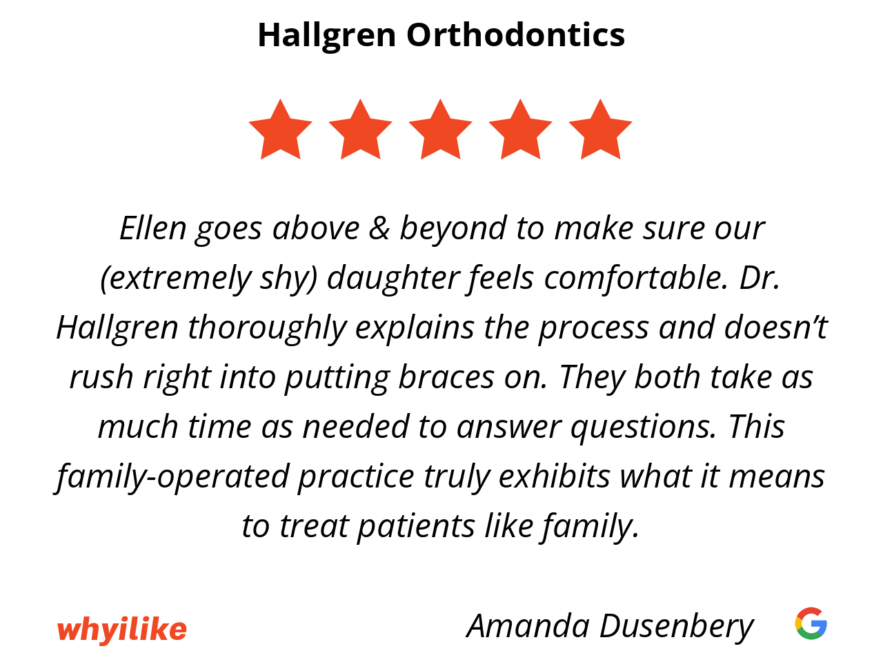 Ellen goes above & beyond to make sure our (extremely shy) daughter feels comfortable. Dr. Hallgren thoroughly explains the process and doesn’t rush right into putting braces on. They both take as much time as needed to answer questions. This family-operated practice truly exhibits what it means to treat patients like family.