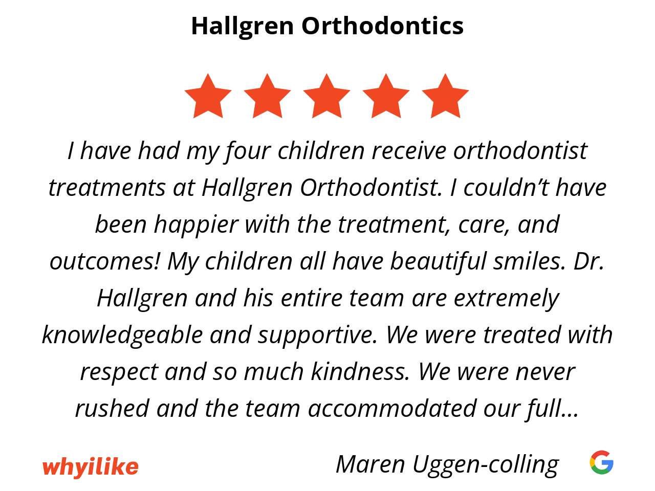 I have had my four children receive orthodontist treatments at Hallgren Orthodontist. I couldn’t have been happier with the treatment, care, and outcomes! My children all have beautiful smiles. Dr. Hallgren and his entire team are extremely knowledgeable and supportive. We were treated with respect and so much kindness. We were never rushed and the team accommodated our full schedule for appointments. Our questions were welcomed and answered in great detail. This is a very well run and highly professional office!