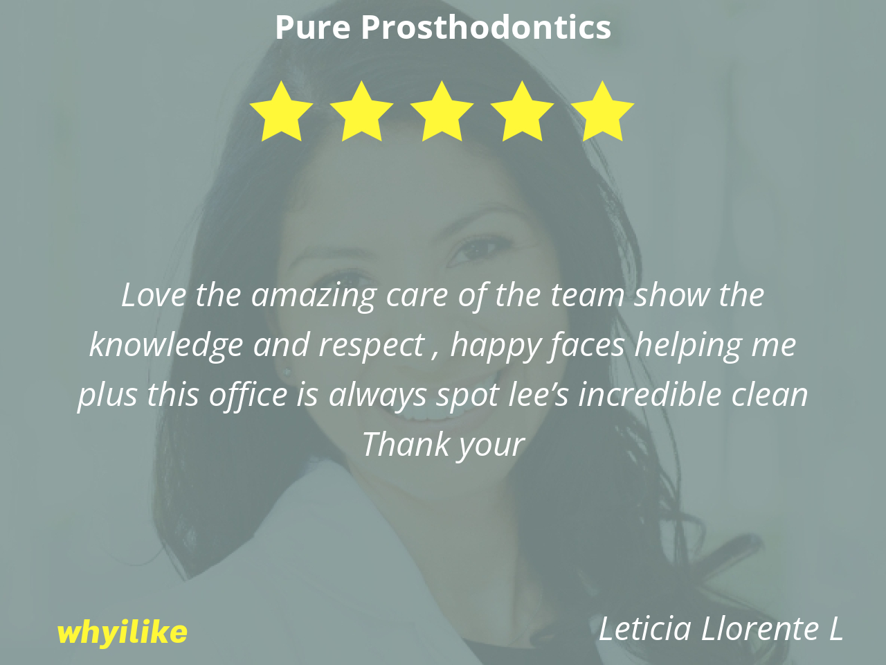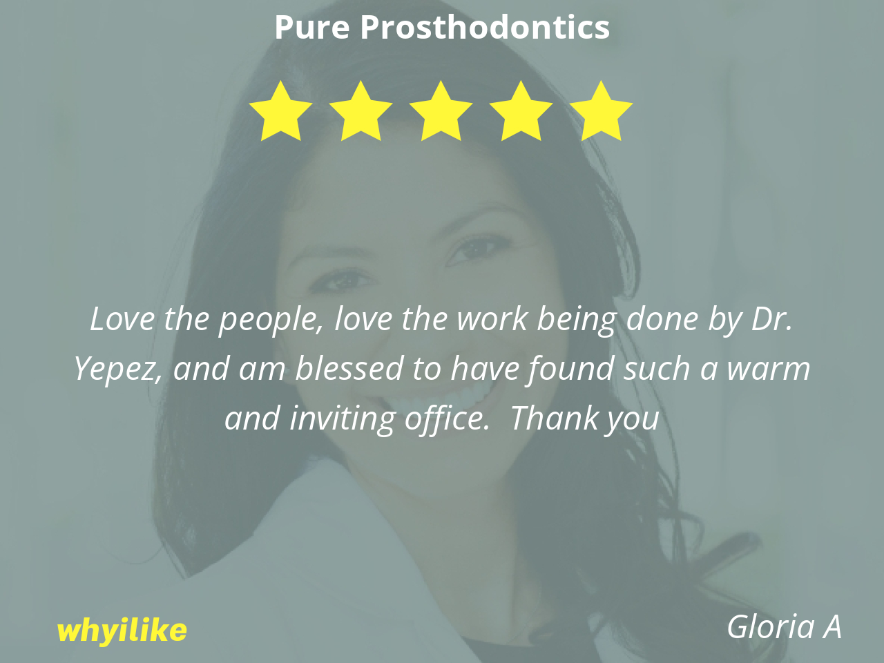 I love Dr. Yepez and her staff. Dr. Yepez is very personable and takes the time to get to know her patients. As well as the staff. She let's you know what is happening every step of the way. Very gentle and very precise. I can tell she is very meticulous and precise in her work. I would recommend Dr. Yepez and PureProthodontist for anyone with dental implants for cleaning and maintenance of their teeth.
