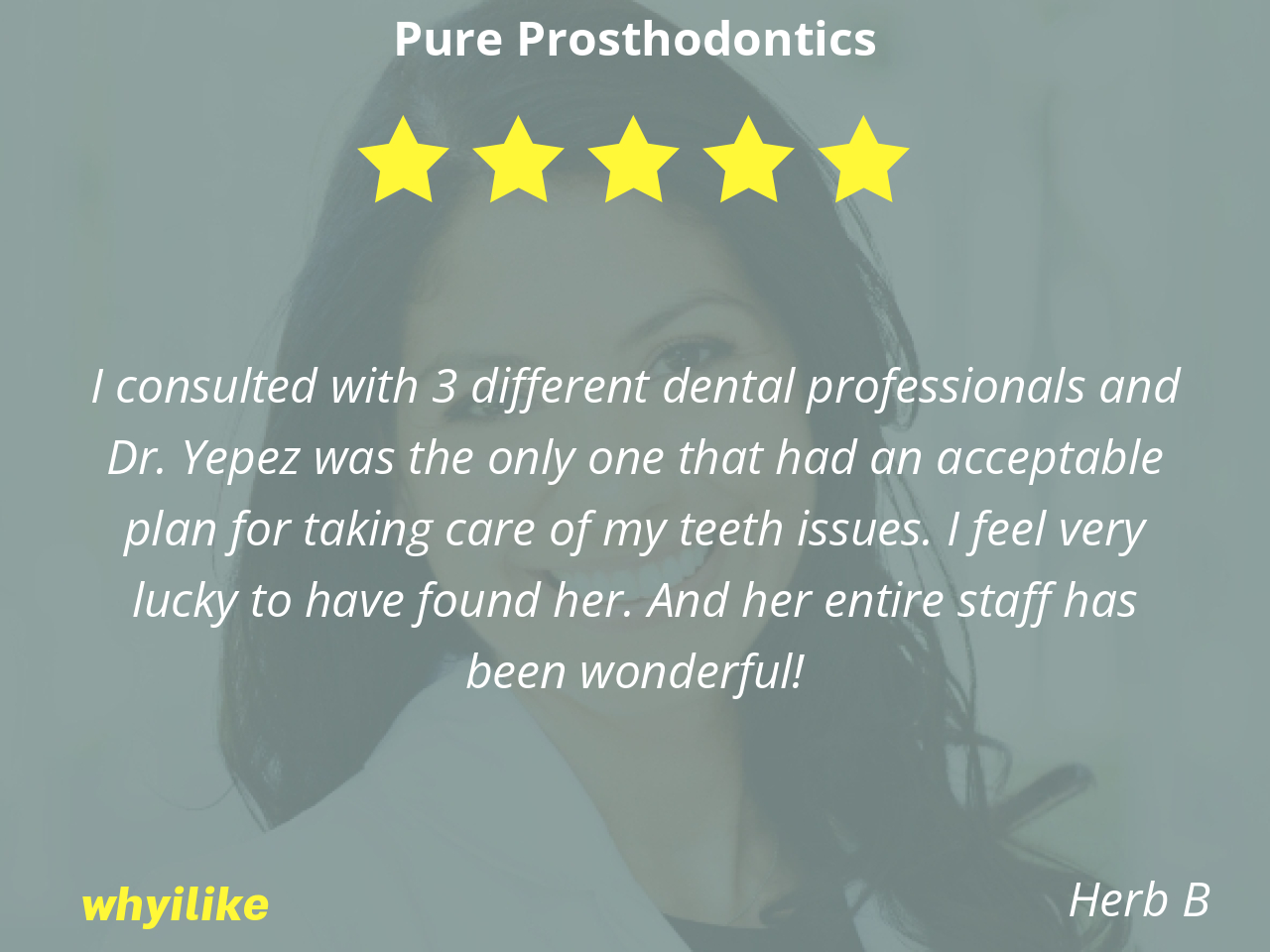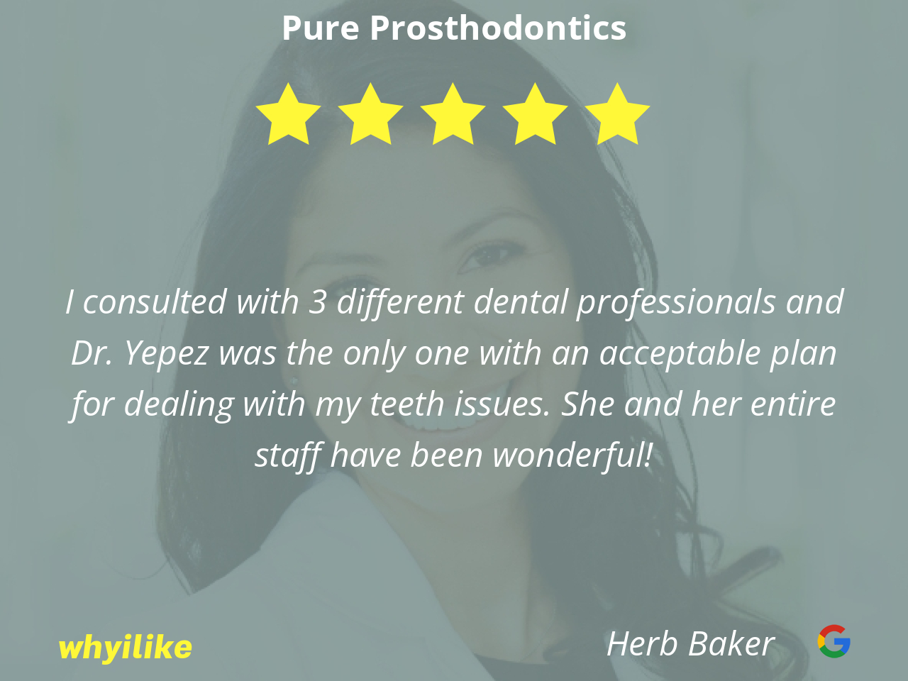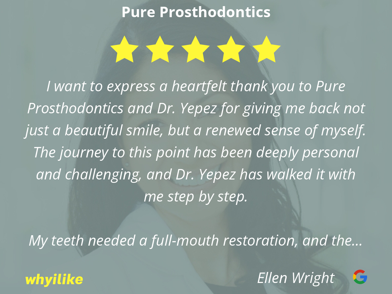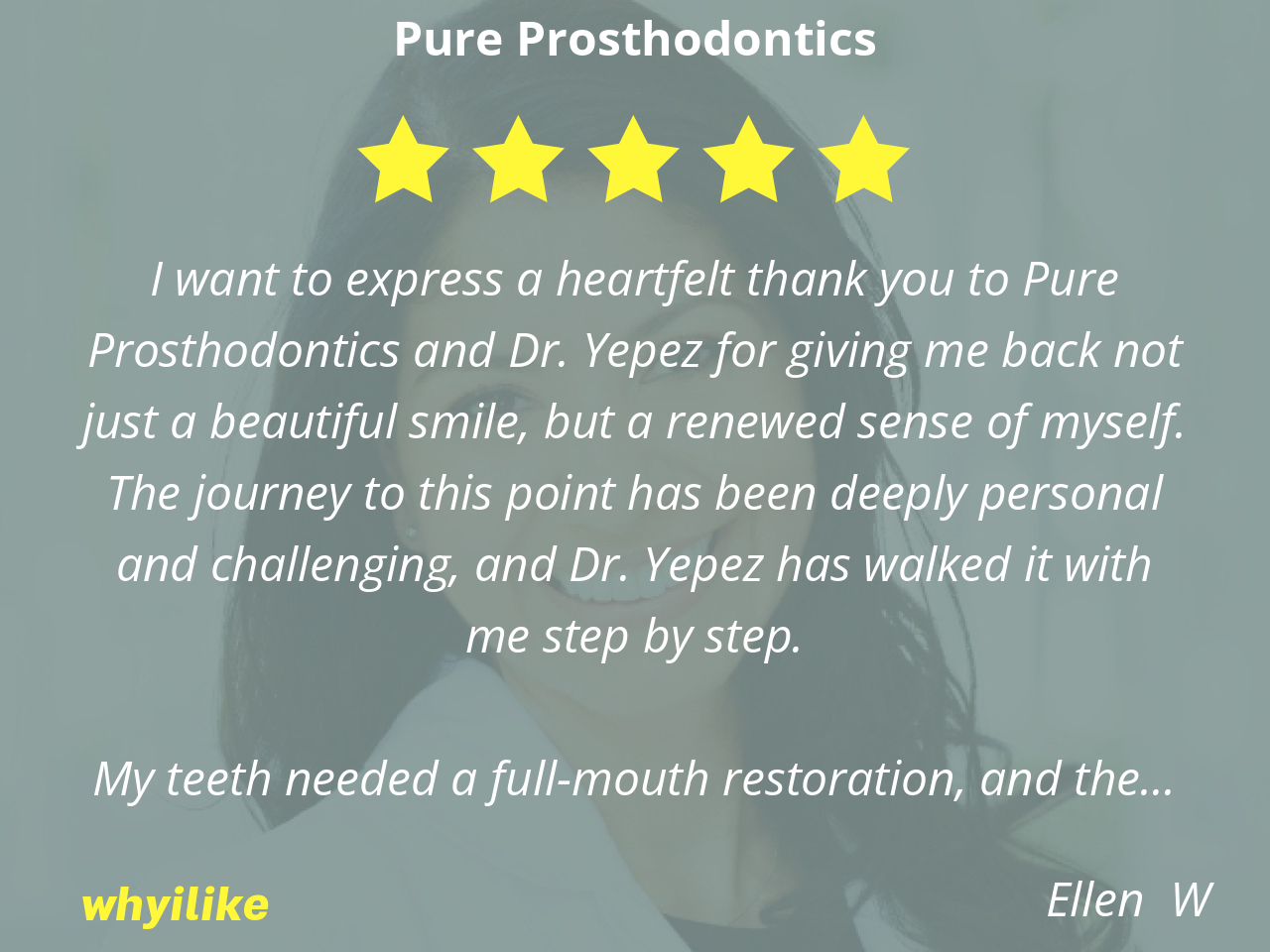 If you’re seeking prosthodontic or cosmetic dentistry and want a clinician who combines expert skill with genuine, patient-centered care, I highly recommend Pure Prosthodontics and Dr. Yepez. They’ve helped me not only restore my smile but reclaim my confidence and sense of self.