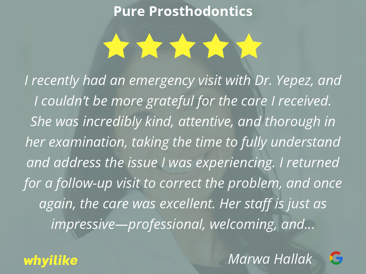 I recently had an emergency visit with Dr. Yepez, and I couldn’t be more grateful for the care I received. She was incredibly kind, attentive, and thorough in her examination, taking the time to fully understand and address the issue I was experiencing. I returned for a follow-up visit to correct the problem, and once again, the care was excellent. Her staff is just as impressive—professional, welcoming, and compassionate. I highly recommend Dr. Yepez to anyone looking for a skilled and genuinely caring prosthodontist.